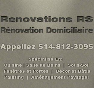 RS Renovation est spécialisé dans la rénovation de cuisines, salles de bains, sous-sols, portes et fenêtres, planchers, peinture, aménagement, ajout et transformations de maison. Nous sommes situés à Montréal, Québec, Canada et fournissons des services de rénovation dans les secteurs suivants : Île de Montréal, Laval, Longueuil, Terrebonne, Repentigny, Brossard, Dollard-des-Ormeaux, Blainville, Chateauguay, Saint-Eustache, Kirkland, Pierrefond, etc.